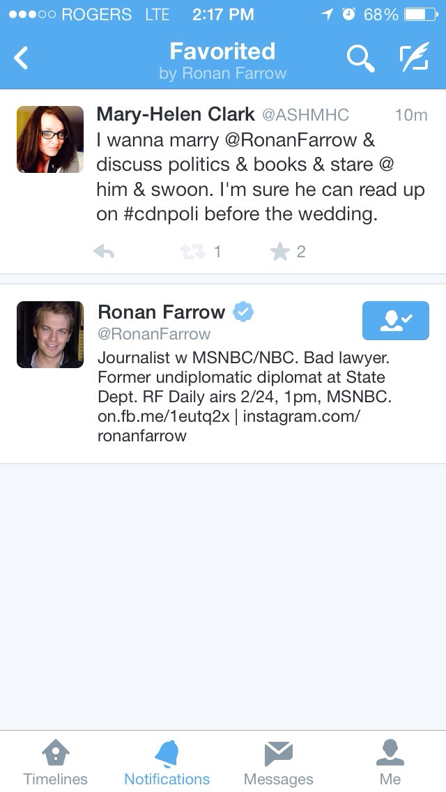 3. Ronan Farrow favourited my tweet, which means he knows I’m alive. That’s step one towards our wedding in the Hamptons & us becoming a journalist power couple.