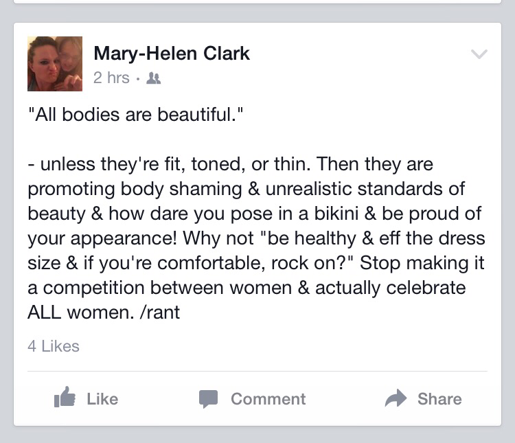 I’ll get “uh, MHC, body shaming still happens, it’s REAL. Just because it doesn’t bother you doesn’t mean it isn’t a thing.” Yup, still is a thing. I get accused of it all of the time because of my fitness posts on social media, but here’s the thing; you are in control of your body. If you love yourself, no one can shame you. My belly isn’t taut & my thighs have cellulite, but I am strong. And I’m proud of my strength. The definition will come if I work hard. I’ll always have double D’s & big hips. But I also have daughters & it’s more important that I embrace those double D’s & deadlift thighs than I fit in a size three. And no amount of body shaming will make me stop loving my body so my daughters emulate self love. Tess Holliday is successful because when she looks in the mirror, she sees beauty. When Ronda Rousey looks in the mirror, she sees beauty (& the knowledge that she can kick the crap out of anyone who thinks otherwise). You need to see beauty when you look in the mirror (as I’ve said before) & then no one can hurt you.